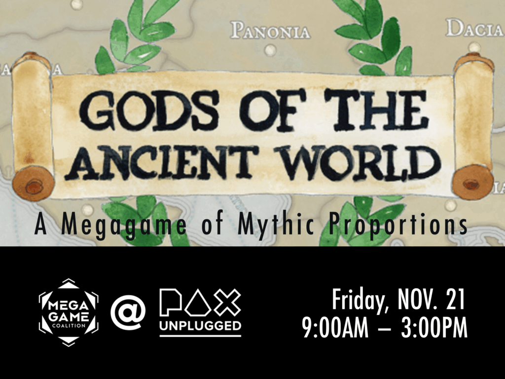 Megagame Coalition is proud to produce five megagame events for PAX Unplugged 2025. This year featuring GODS! MECHS! ROMANTASY! AND MORE!