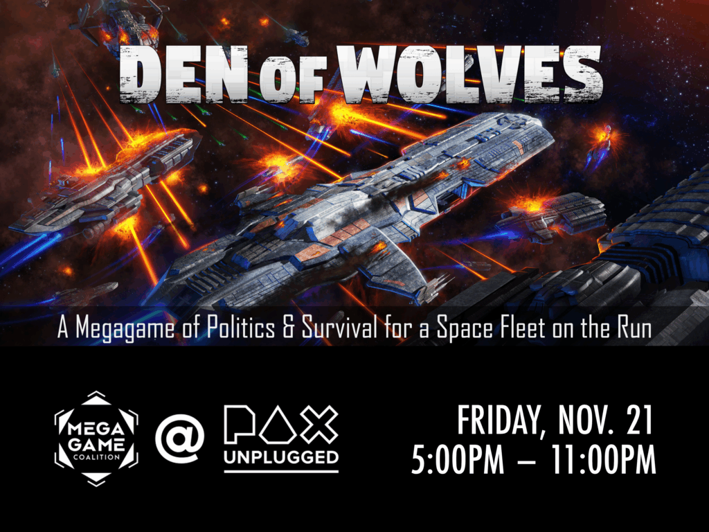 The Megagame Coalition is proud to present Den of Wolves – the modern megagame classic by the UK upstart designer, John Mizon of SW Megagames. The Infinite Domain expansion was designed by Chris Perry & Cle Diggins of Portland Megagames, who will also be gamerunning the event!