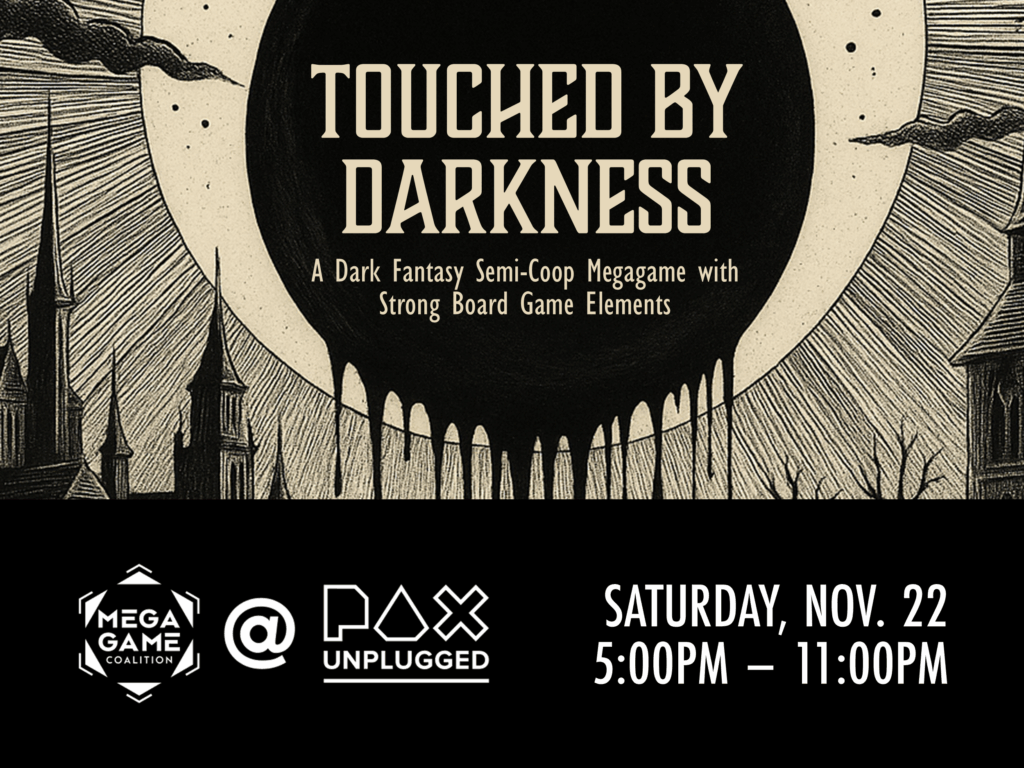 The Megagame Coalition is proud to present Touched by Darkness – a semi-cooperative dark fantasy megagame by games designer Ben Kanelos (BK Game Design)