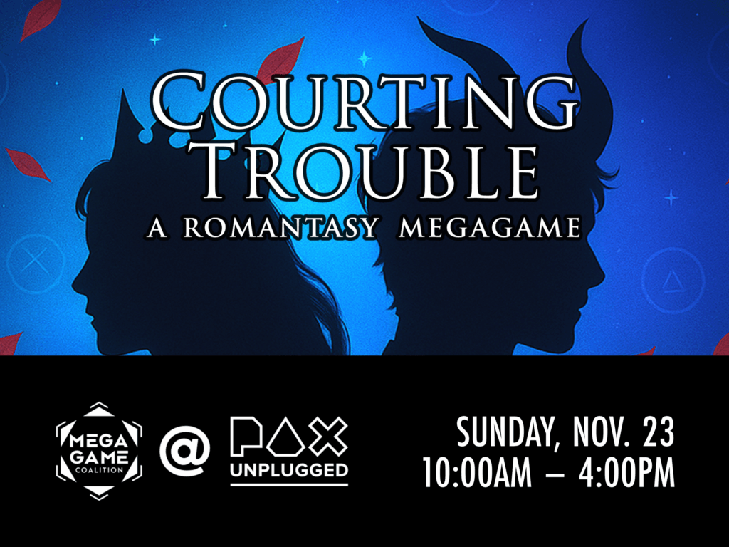 The Megagame Coalition is proud to present the Courting Trouble by Benjamin Kanelos of BK Games – the first ever romantasy megagame (citation needed). Courting Trouble premiered recently at Gen Con 2025 (under the title of Bound by Desire) to great acclaim! The game was the second highest-rating megagame of the convention (behind the recent expansion of the Den of Wolves megagame, Den of Wolves: Infinite Domain – that’s also coming to PAX Unplugged).